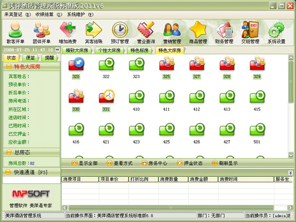 美萍酒店管理系统是美萍公司推出的一款专业的酒店管理软件,它集前台酒店客房管理系统(酒店客房管理软件),酒店员工管理系统,酒店客户管理系统,酒店物品管理系统,酒店订房系统等强大功能为一身,充分结合 酒店业的管理实情,系统界面简洁优美,操作直观简单,无需专门培训即可正常使用。是广大酒店宾馆,饭店,旅馆,招待所等信息化管理场所理想的宾馆客房管理软件。