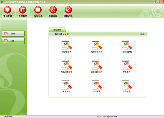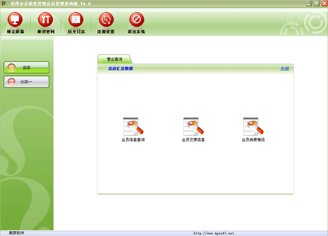 | 会员业务查询端的主要功能:总店汇总的会员信息、充值信息、消费情况。查看每个分店的往来帐务、业务排行、采购情况、营业报表等。 | |
