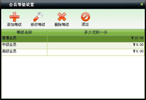 | 2.1.2、修改等级:选择要修改的会员等级,点击“修改等级”按钮或在表格上双击或在表格右键菜单中选择“修改等级”,打开修改等级界面,输入要修改的内容,点击“保存”按钮即可。 |