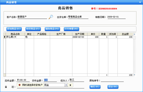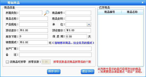 在商品信息这一部分输入新增商品的所有信息,点击“保存”按钮即可把该商品保存到右边的已存商品中,保存后可以继续输入下一种商品。在“已存商品”中可以点击鼠标右键对选中的商品进行删除或删除全部已存的商品。如果商品增加完后可以直接点“退出”按钮。退出增加商品窗口后会在商品列表中看刚才增加的商品。如果要修改商品,先选中要修改的商品,点击“修改”按钮打开商品修改界面,在商品修改界面中修改相应的信息点击“保存”即可。点击“删除”按钮即可以把选中的商品删除,该商品发生过业务则是不能删除的。