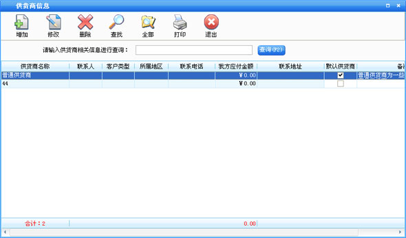 在基本设置模块中点击“供货商信息”按钮打开供货商信息窗口如图5。在窗口中可以看到所有的供货商。点击“增加”按钮打开增加供货商窗口,输入供货商的信息,供货商名称不能重复。如果该供货商有期初金额就在“期初应收”后输入相应的金额。如果选择中“默认供货商”在采购进货和采购退货打开窗口的时候显示的为该供货商,默认供货商只能有一个。点击“修改”按钮可以修改选中的供货商信息。如果该供货有业务发生,则不能再修改期初实付金额。点击“删除”按钮可以删除选中的供货商,如果该供货商有业务发生则不能删除。系统有一个“普通供货商”是不能被删除的。点击“查找”按钮打开供货商查询窗口,输入相应的条件查询不同的供货商信息。点击“全部”按钮可以列出所有的供货商信息。 |