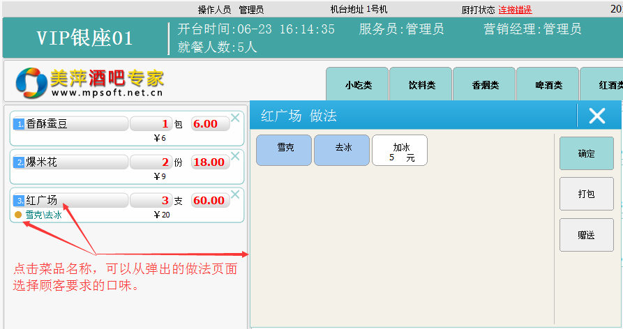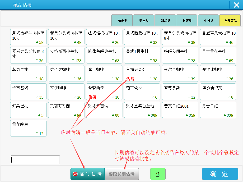 | 1.菜品沽清:分为临时沽清(隔天自动转为正常状态)和餐段长期沽清(如胡辣汤只在早餐供应,则每天超过早餐时段,胡辣汤自动进入沽清状态)。 |