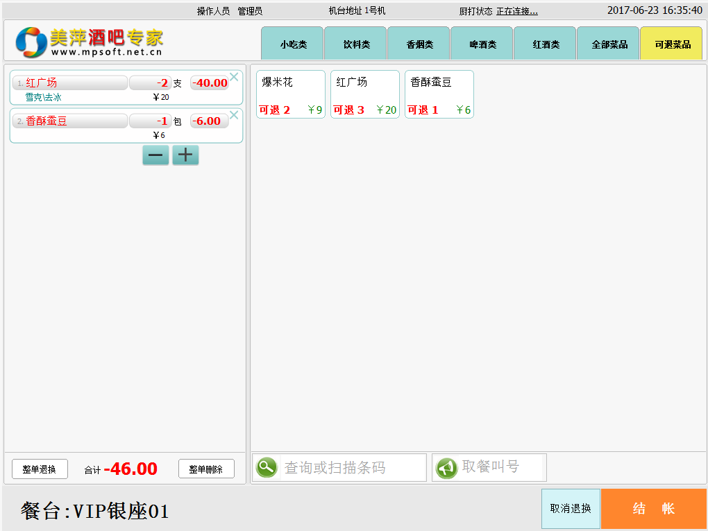 | 3.退换菜操作:只有堂吃和外卖收过款后才能在新近账单的单据中进行此操作。 |