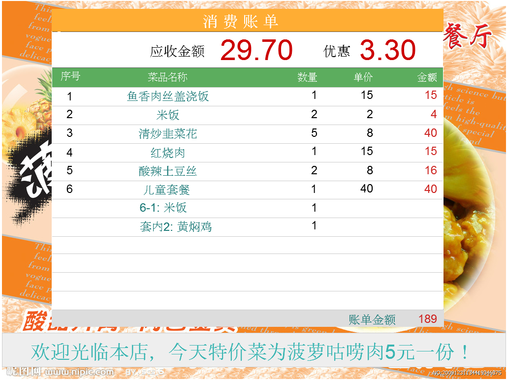 | 16.双屏管理:业务管理→双屏设置,可以让顾客面对的屏幕显示广告画和广告语,还有消费账单。 |