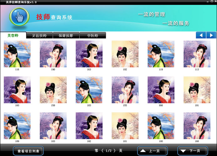美萍技师查询系统是为高档的休闲会所提供的一种“自助式“技师查询系统,本系统可用来查看技师的照片和技师的服务信息。通过本系统顾客可以很方便的了解到相应技师的当班状态(忙、闲)和服务班次。不但方便了顾客选择技师也大大提高了会所的服务档次。除此之外,顾客还可以通过本系统查看会所提供的服务项目和商品项目,让顾客做到有的放矢的消费! (如果您需要提高会所形象,如果您需要提高服务质量。那么您可以将休闲会所管理系统和技师查询系统结合使用。技师查询系统可以安装在触摸屏设备上,也可安装在普通电脑上。安装后您可以将此终端放置在包间内,也可放在营业区内供顾客人使用。) |