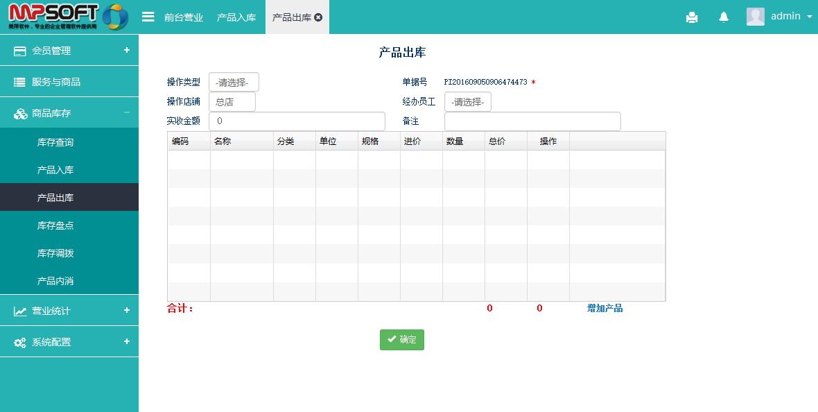 选择出库操作类型、操作店铺及操作员,并在下方增加要出库的产品,点击确定出库;