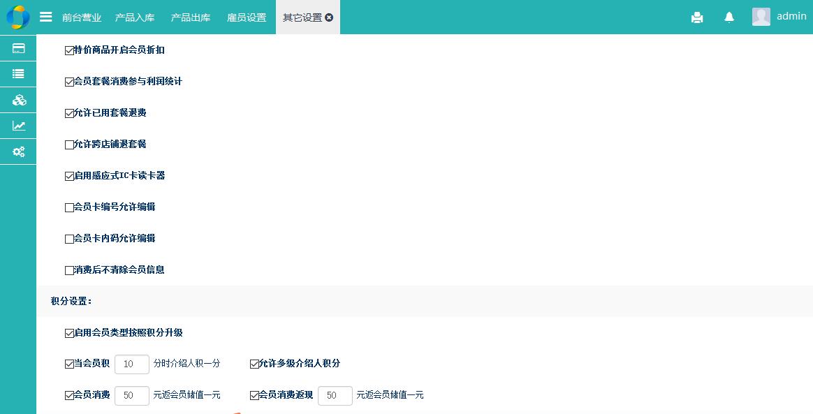 其他设置: 可设置使用软件的设置,设置窗体更大数量,消费积分,是否允许负库存业务等。
