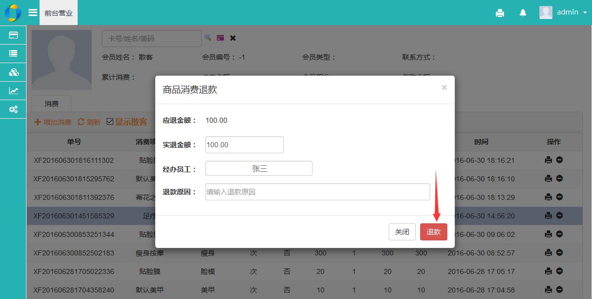 支持商品和服务退款!系统检测到可退的商品消费单会增加一个退款按钮,点击退款按钮输入实际退款金额及经办人和原因即可立即退款!