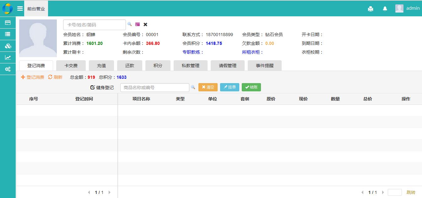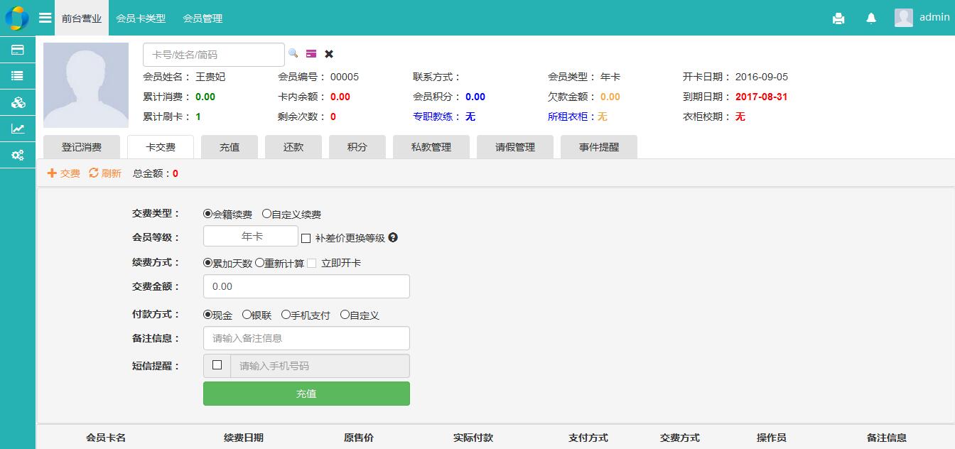 选择会员并加载会员基本信息后,系统会自动扩展会员的特权功能,包括充值、积分、还款、时间提醒、日志等;