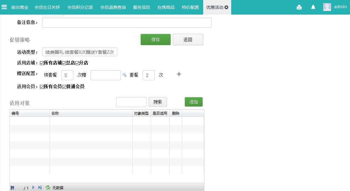 此功能主要针对所有的项目、套餐、商品进行特价配置,并指定店铺促销方案;