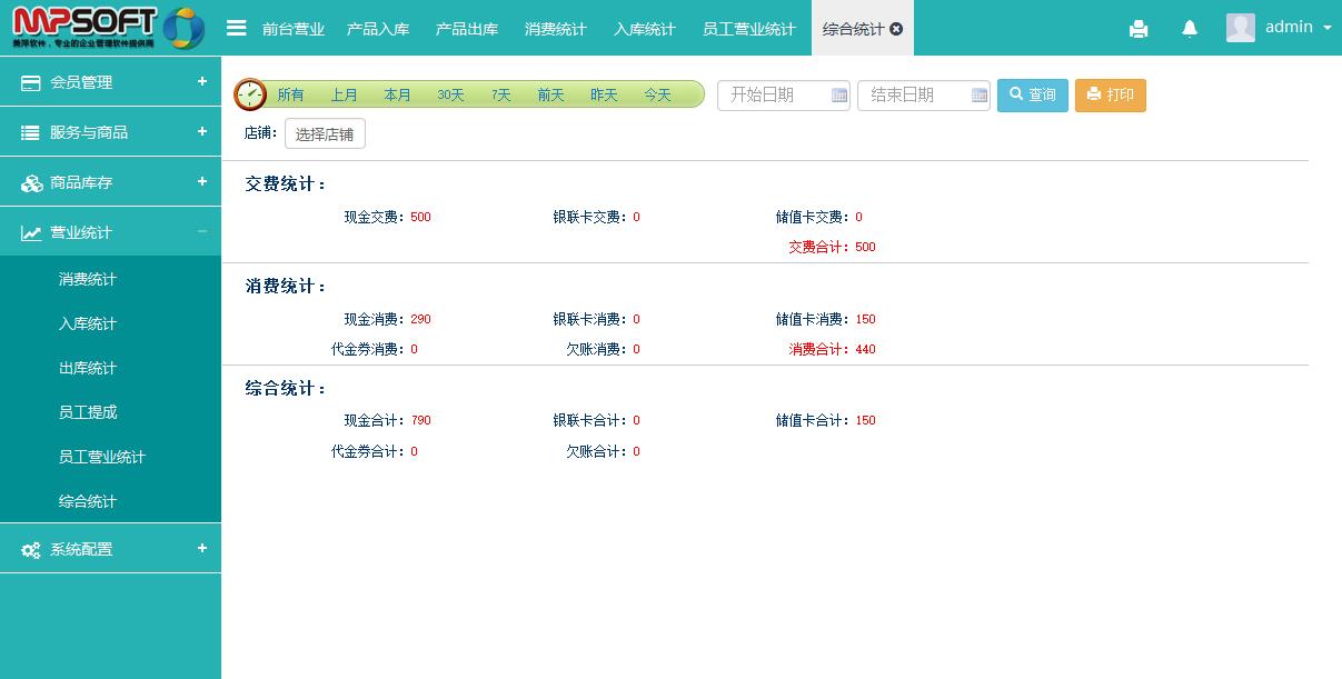 综合统计: 汇总统计所有的项目、商品、套餐等销售信息,支持打印和导出。