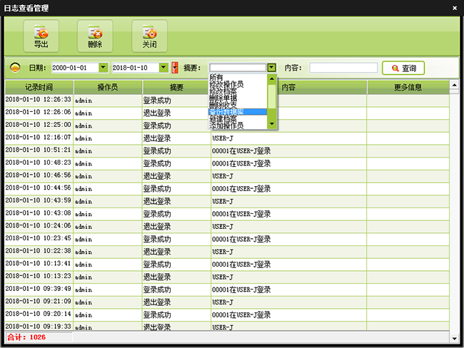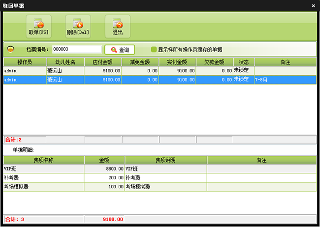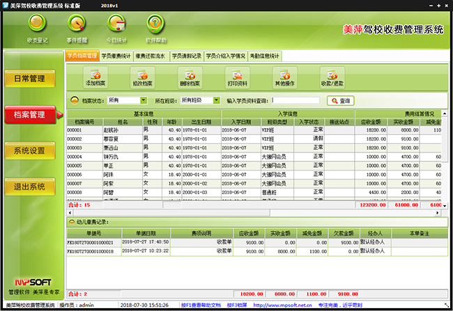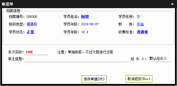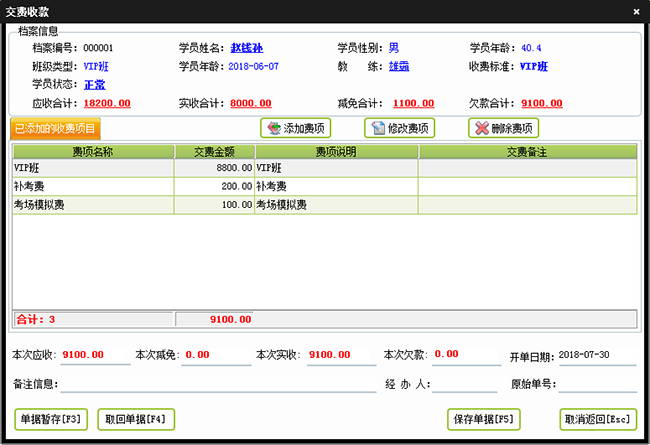 | 日常管理当中可以进行新档案登记、费用收退、请假销假、事件管理等操作。在费用收退中即可以添加新的收款单据、退款单据,也可以对以有的单据回款,收款,删单等操作。 | |
