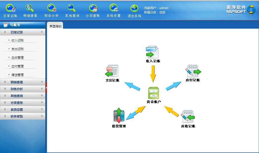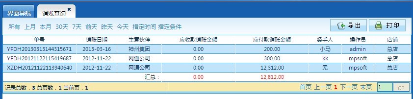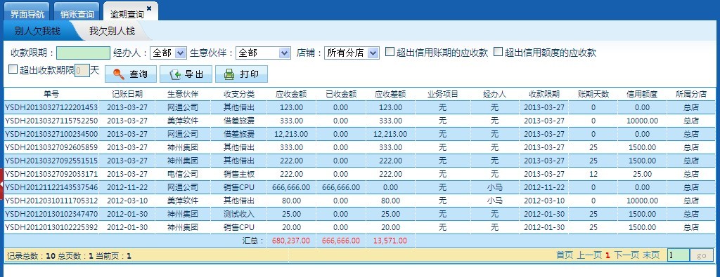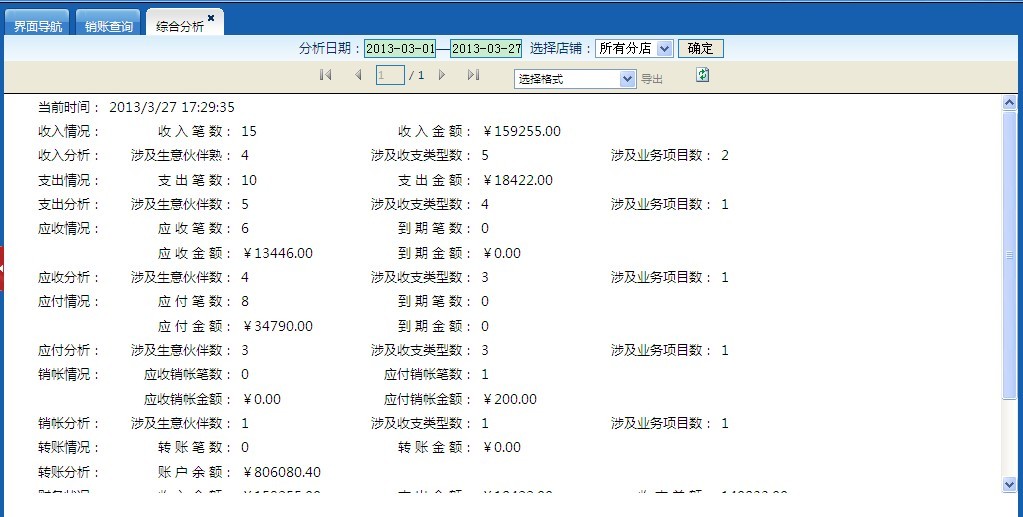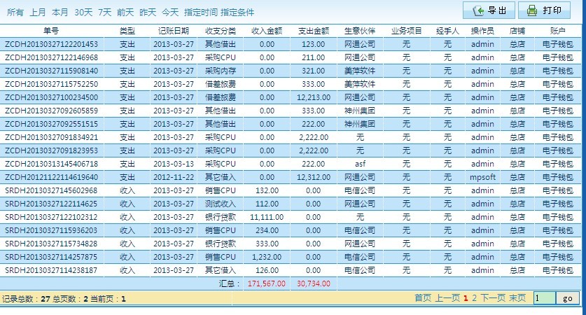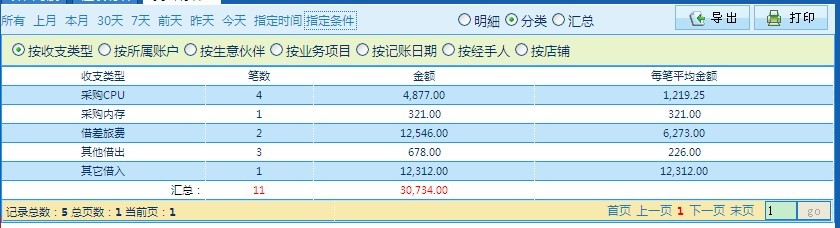 同时可以按照“收支类型”,“账户”,“生意伙伴”,“业务项目”,“日期”,“经手人”,“店铺”条件进行汇总查询。 |