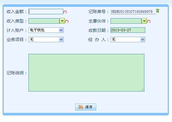 | 1.1、收入记账:记收入帐可以通过下图界面来实现 |