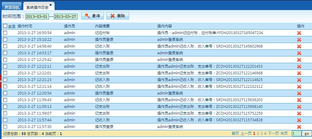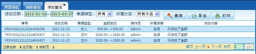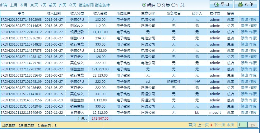 收入明细,支出明细,应收明细,应付明细转账明细大体功能都一致这里用收入明细来举例:查看明细的同时可以对某一个账单进行“修改,作废”,应收,应付还有“销帐”功能操作 |