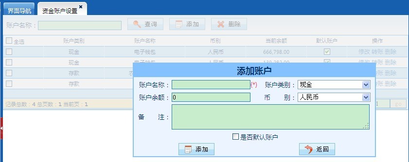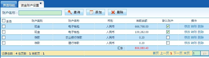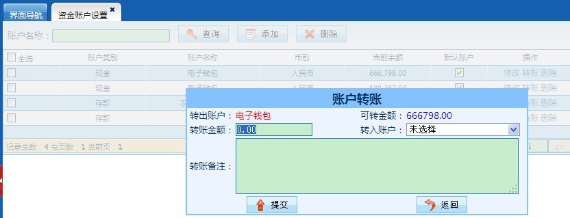 | 4.1资金账户设置:可以对账户进行添加,删除,转账操作 |