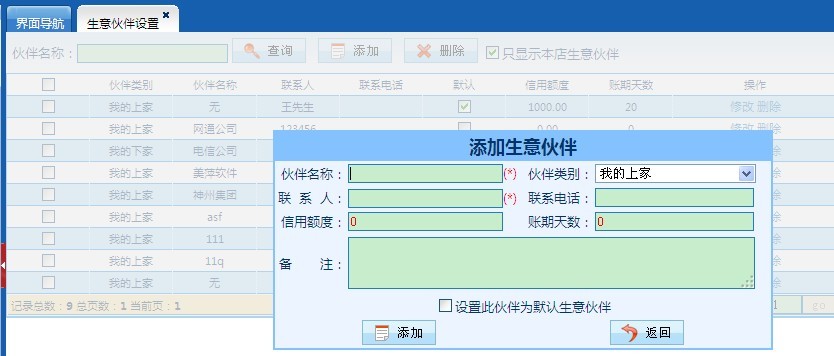 | 4.2生意伙伴设置:可以对你的客户群体进行添加,删除,信用额度设置 |