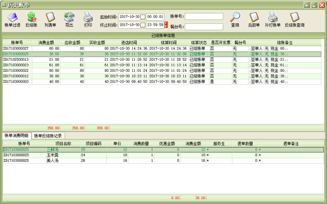 4、历史账单---功能:主要用来查询已结账单的情况,可补打后厨单、补打账单、还可以反结账。 |