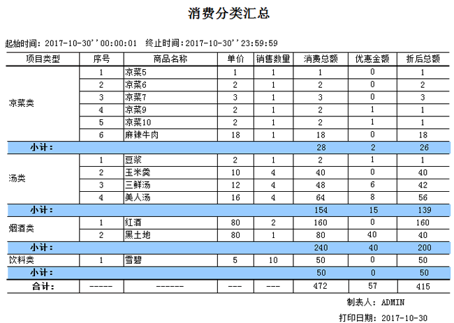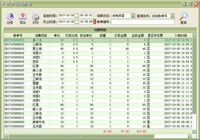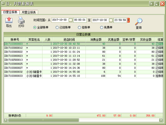 8、按账单类型分类统计---功能:分类汇总指定时间范围内统计结账,挂账,免费账单,可导出和打印。 |