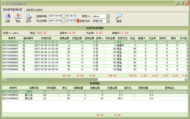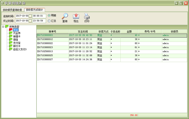 2、收银明细查询---功能:在选择的时间范围内,按收款人分类查询其收款明细。 |