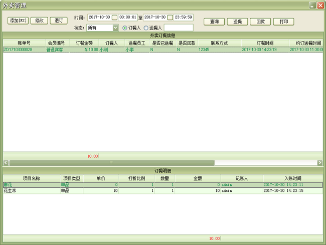 - 添加订餐信息后,可对订餐进行送餐标记和回款标记,便于对订餐的管理,及时查询订餐状态。
