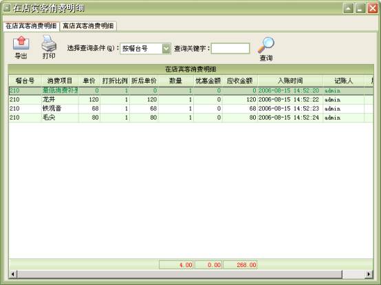点单消费→增加消费:客人在消费过程中所消费的所有项目均要进行入帐处理,以便在客人离店时自动计算消费额。客人的消费明细便是在此入帐。