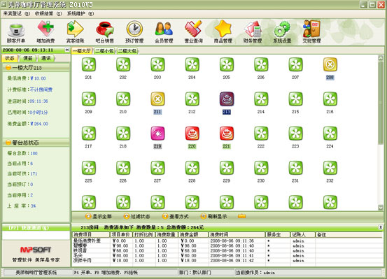 来宾登记→顾客开单:每个客户发生消费前必须进行登记(建立客户帐),给客户安排一个房间(餐台)等房间项目,房间项目必须是在“系统设置”模块中的“房间项目”中已经设置,系统只能对已设置的房间项目(餐台)进行登记。