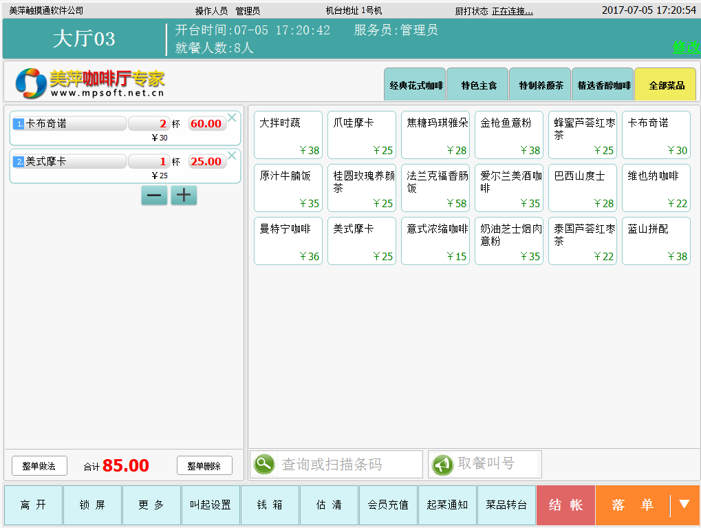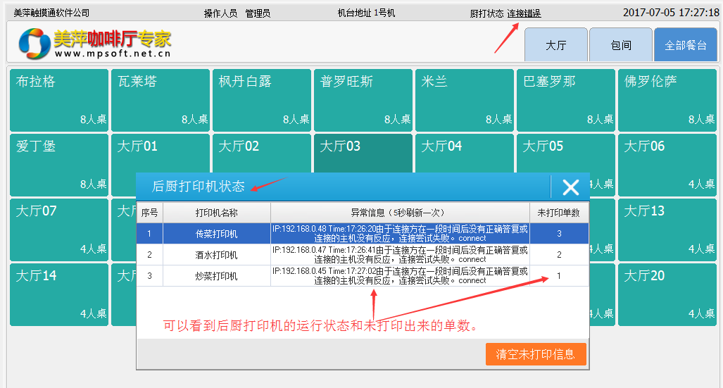 | 3.后厨打印状态:前台可以随时掌控厨房打印机的运行状况。 |