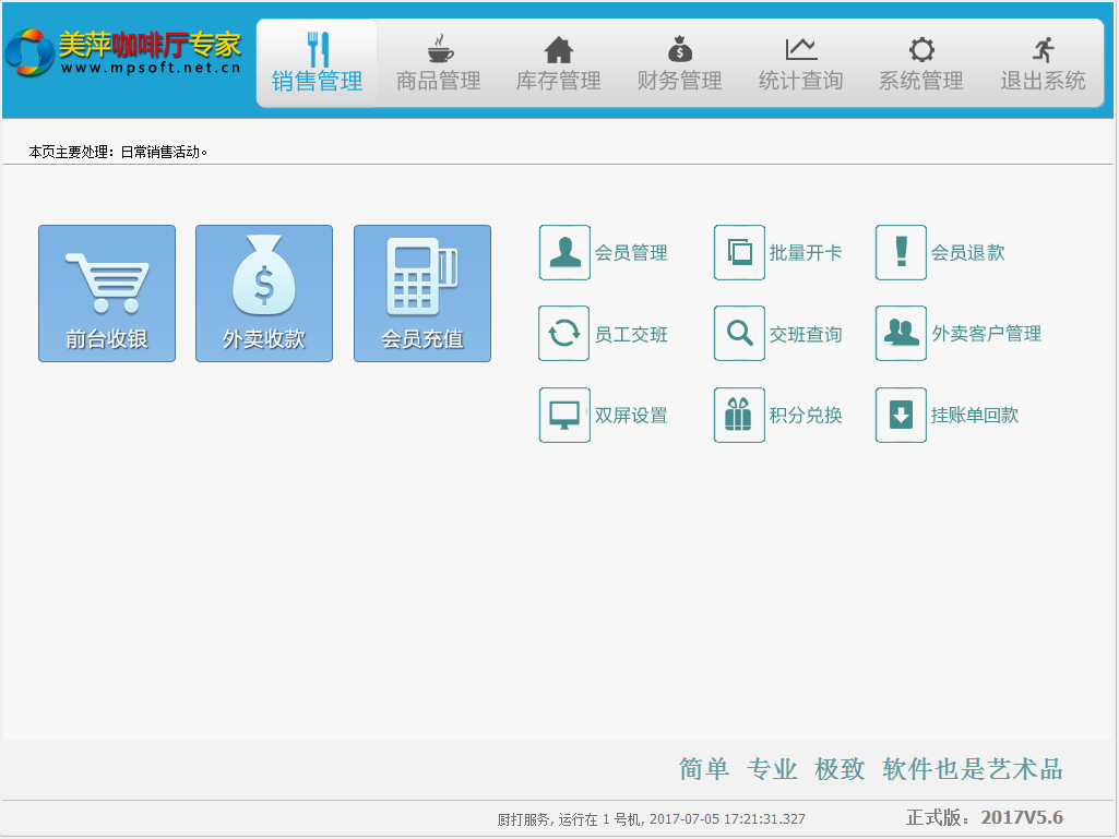 | 1.堂吃点餐消费:从系统主界面→前台收银 |