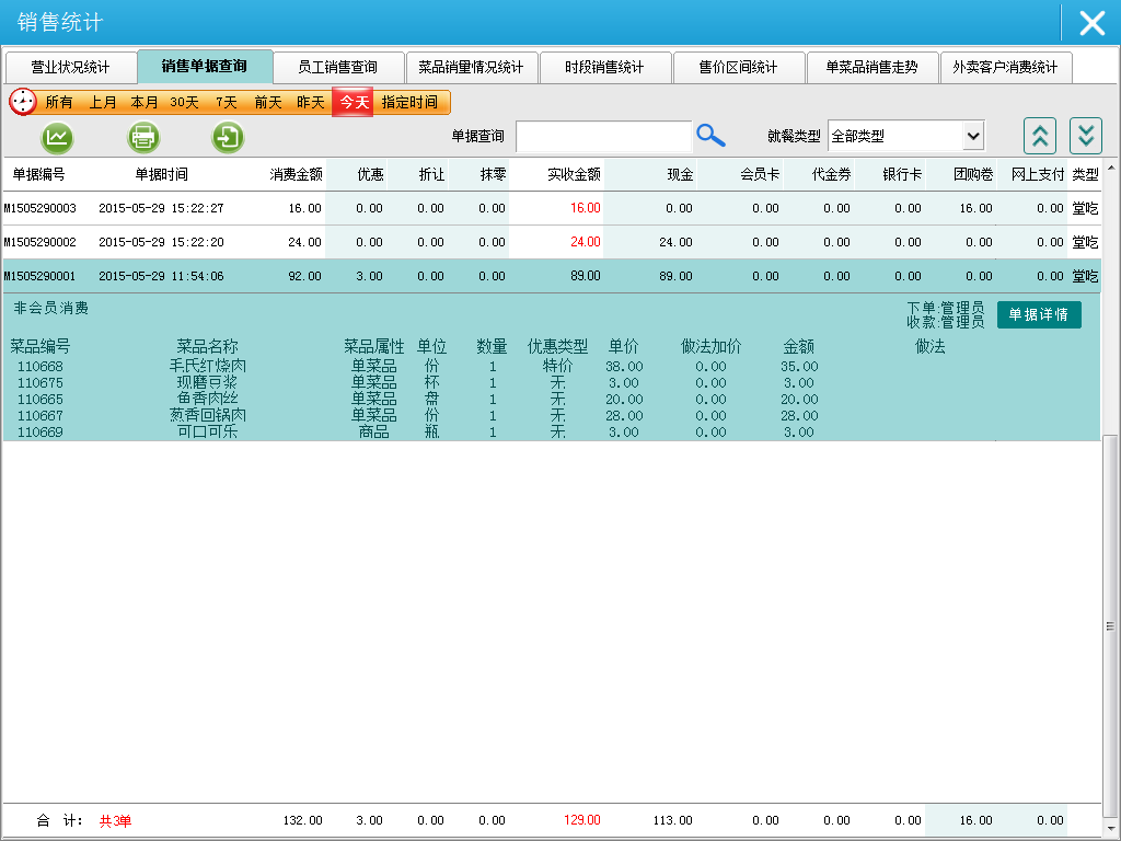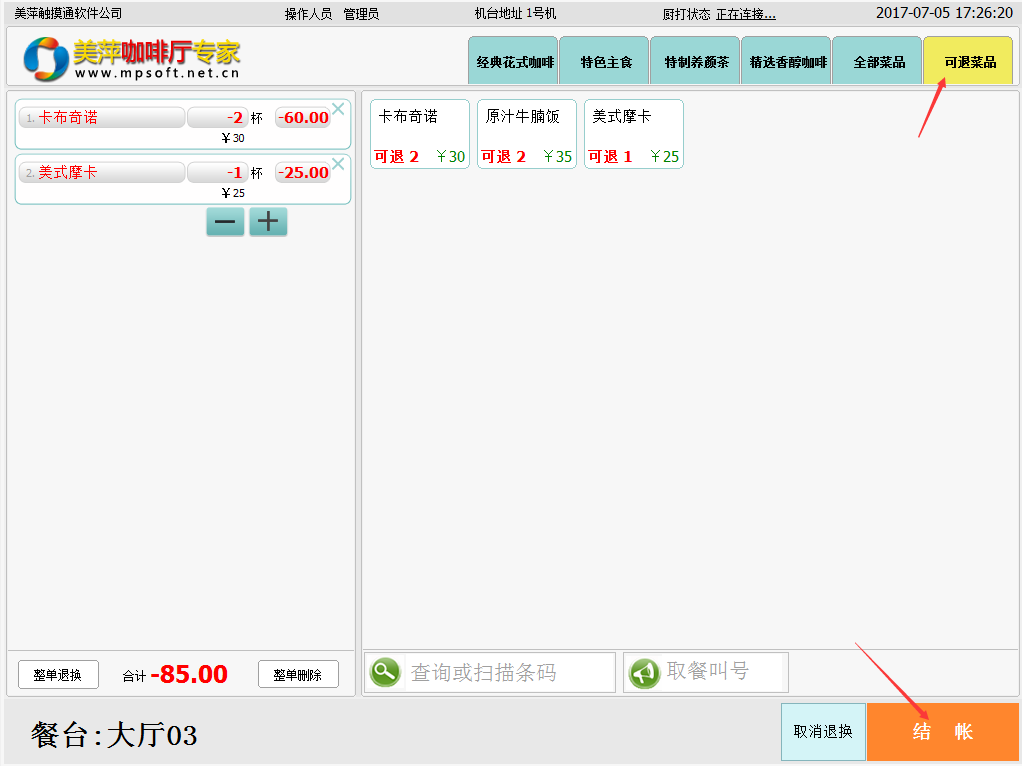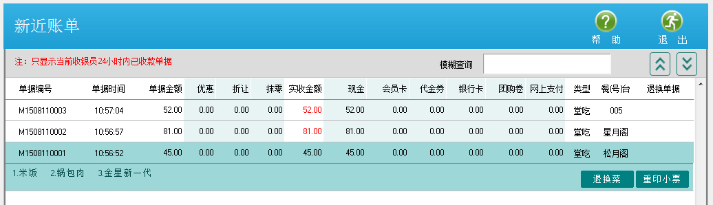 | 3.退换菜操作:只有堂吃和外卖收过款后才能在新近账单的单据中进行此操作。 |