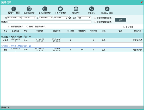 可以查询统计预订信息,也可直接通过预订信息开单入住
