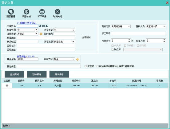 左边以树结构的形式列出入住的房间号(点选筛选该房间的客人信息),选择左侧的房间号,然后点击添加按钮,即可登记随客信息。