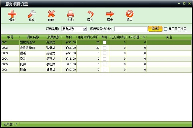 | 服务项目,也叫护理项目,可设置服务时间、回访日期、护理周期等。 | |