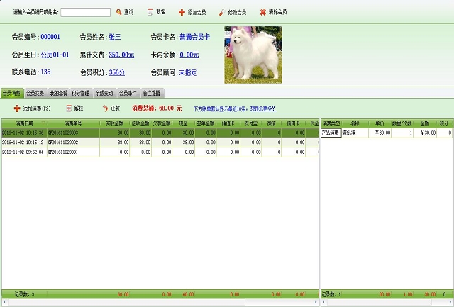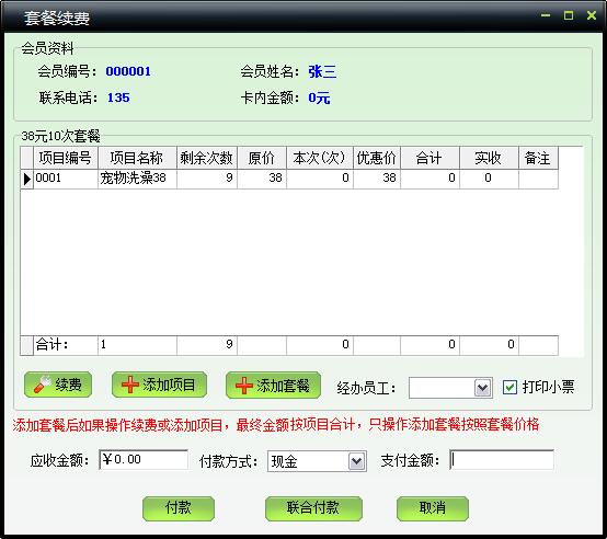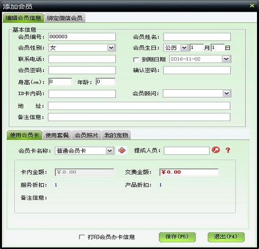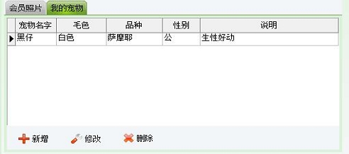 | 包括会员基本信息、本卡售价、销售员工、使用套餐、编辑宠物信息、会员照片等信息 | |