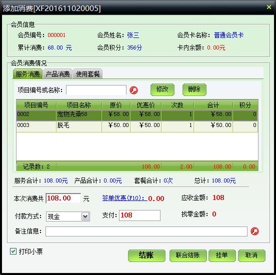 | 一次消费可以包括服务(护理)、产品、套餐三种,可为每一项添加服务人员和床位,结账后计算提成。付款方式非常方便,现金、信用卡、代金券等常见结算方式都有。 | |