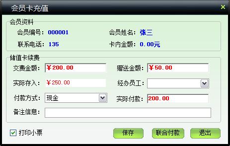 | 包括两项,储值卡充值和套餐充值。充值可以赠送金额,可以选择员工进行提成。 | |