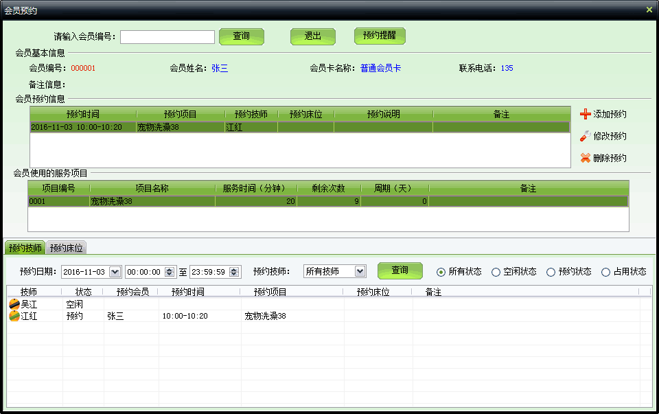 | 在某段时间内预约某美容师和床位,设置后将在预约到达时间前进行提醒。美容师和床位不能重复预约。 | |