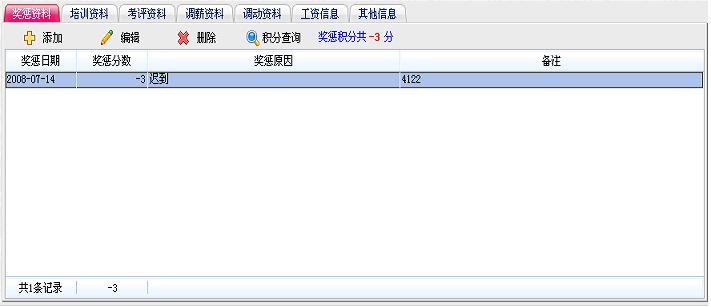 员工的各项人事记录可在选择员工后,在主界面下面的分栏里面进行添加、编辑、删除操作。如图: |