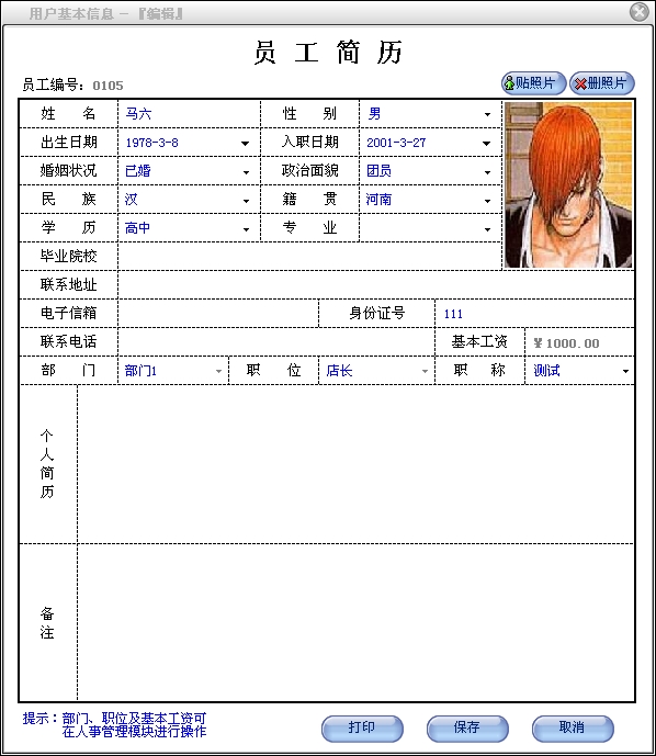 在其他信息模块可以任意输入该员工的相关资料,系统将自动保存 |