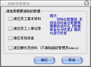 | 初始化数据库前,系统将自动备份系统数据库。在清空员工基本资料时,将同时清空员工的人事记录 |