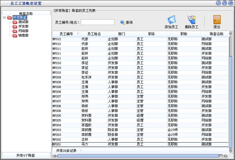 3、可在查询员工的文本框直接输入员工的编号、姓名、姓名的拼音缩写、部门、职位来搜索员工