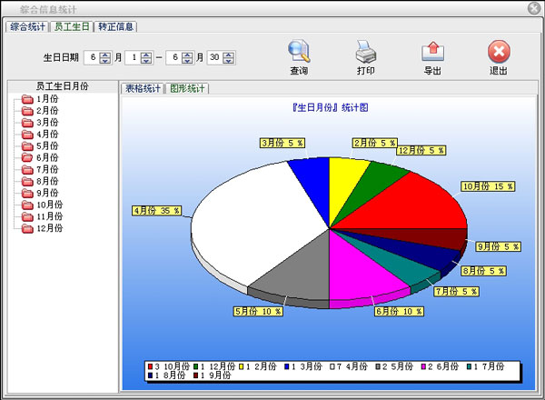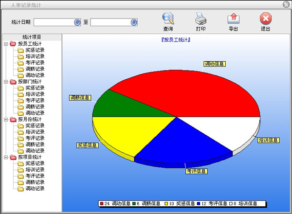 4、统计管理:对员工的资料进行综合信息统计、员工积分统计、人事记录统计、人事信息统计