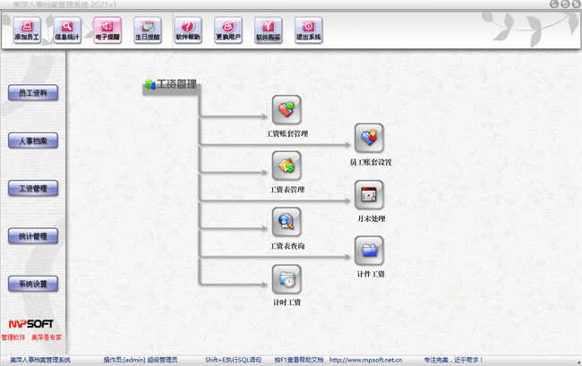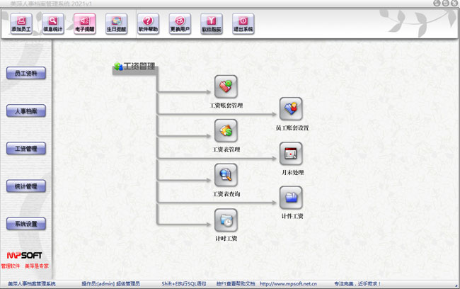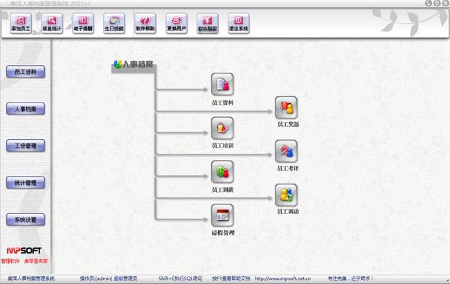 美萍人事档案管理系统是一款专业的人事档案管理系统,人力资源管理系统,人事工资管理软件,美萍人事管理软件界面设计简洁,美观,其人性化的软件流程,使普通用户不需培训也能快速掌握软件操作使用方法,上手极易。强大的报表统计功能更是能让您完整的掌握企业,公司内部的人事,工资,档案的详细情况。美萍企业人事管理软件广泛适用于企业,公司的人事管理,档案管理,是您企业进行人力资源管理的强大工具。