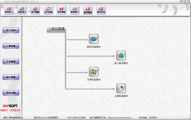 统计管理:对员工的资料进行综合信息统计、员工积分统计、人事记录统计、人事信息统计