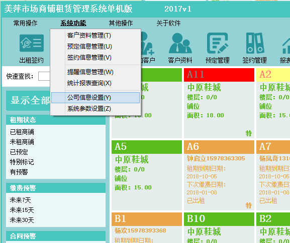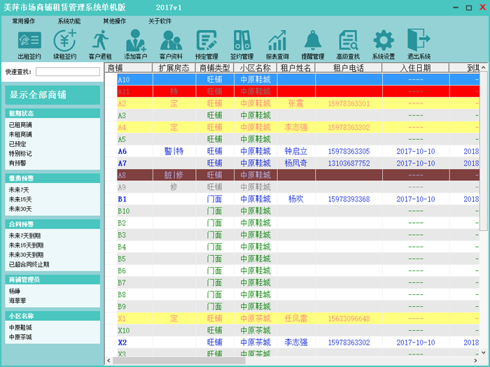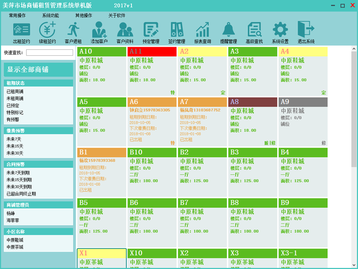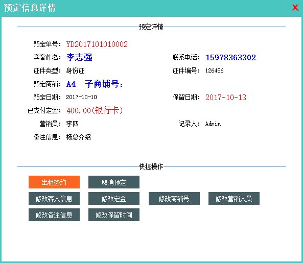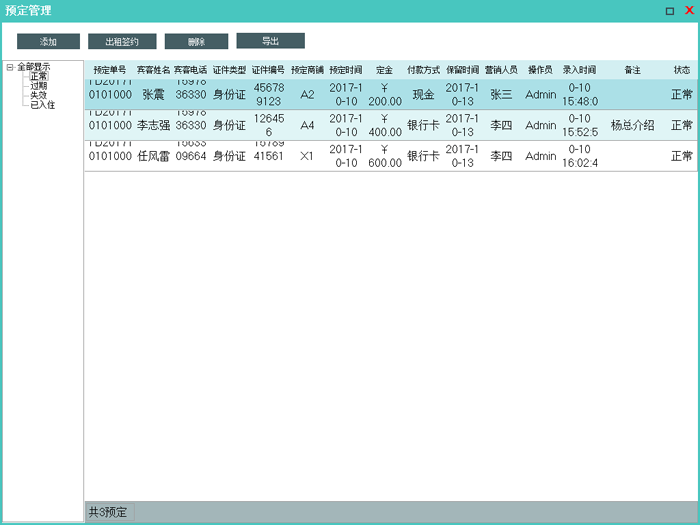 | 预定管理:点击界面左侧的状态信息快速切换查看不同状态的预定信息。针对预定信息的分项修改和状态切换功能,可以点击右键菜单进行操作。 选中预定信息后,点击出租签约,可以快速进入签约流程,操作方便。 |