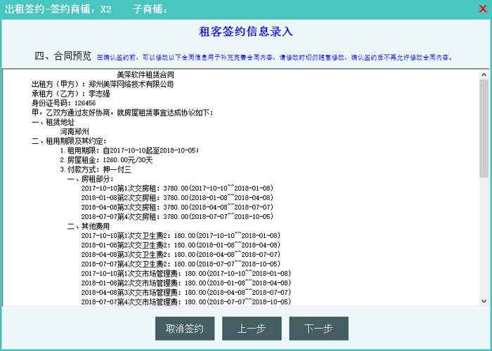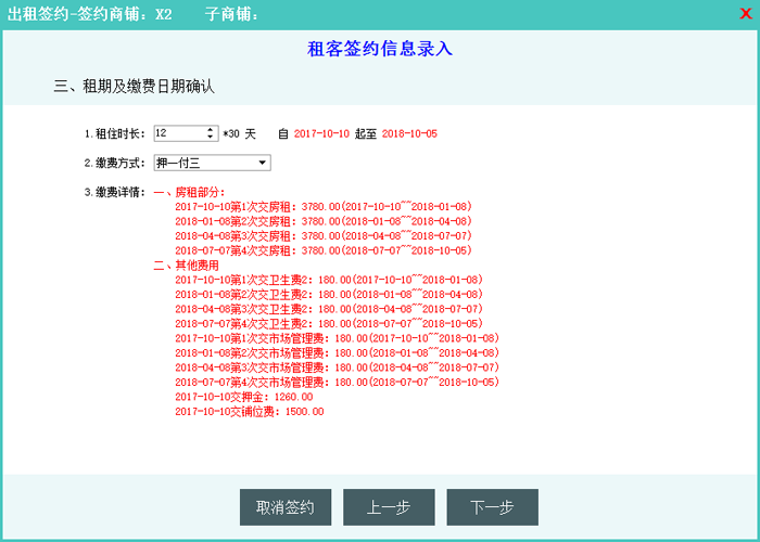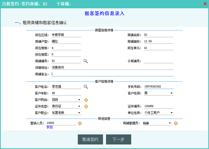 | 3.1、出租签约:在主界面上面点击右键,选择"出租签约"(或者双击可供房间、或者点击主界面上面的快捷按钮"出租签约")即可打开出租签约界面,出租签约分为5步: |