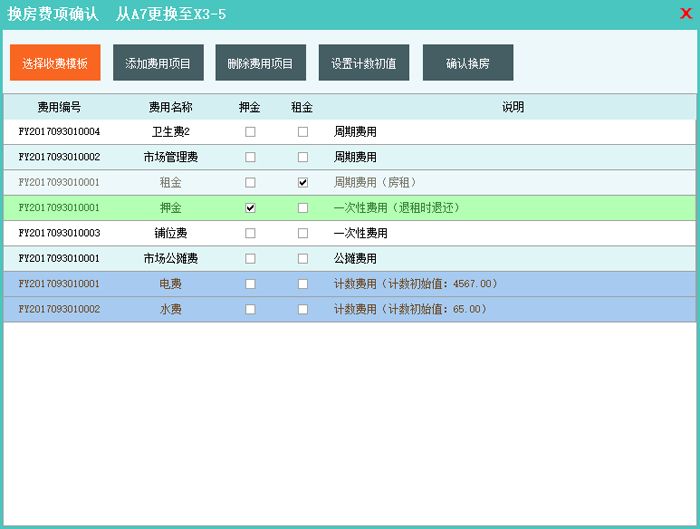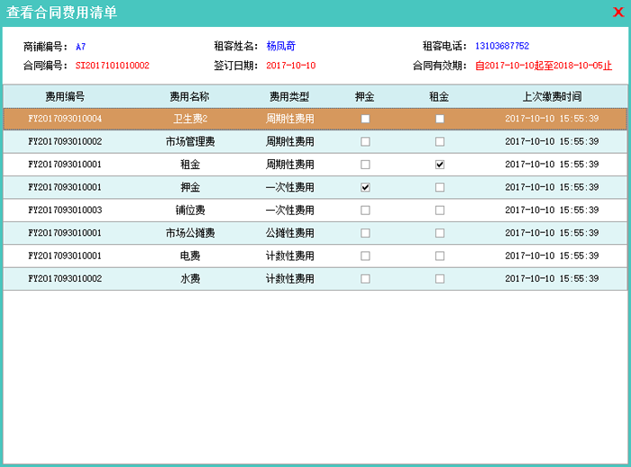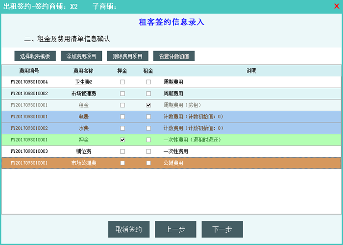 | 1、费用清单确认(软件默认列出当前租约中的费用清单,支持修改费用清单功能 | |