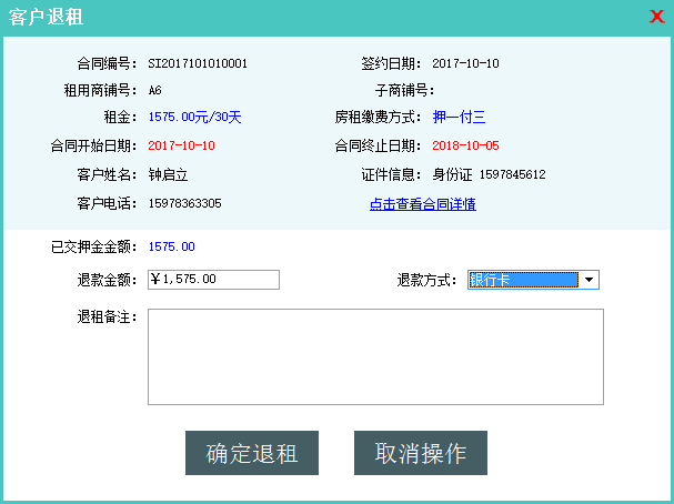 | 在主界面上面点击右键,选择"租户退租"(或者点击主界面上面的快捷按钮"客户退租")即可打开客户退租界面。客户退租界面会显示租户已交押金金额,并默认全额退款(允许手动修改)。录入退款信息和退租备注后点击确认即可完成退租过程。 |