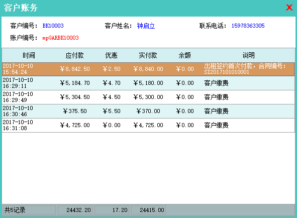 | 5、承租人付款确认:出租签约的更后步骤,如果客户之前预定有付定金的话,软件支持使用已付定金冲抵应付款(需要设置运行参数"优先从客户余额中扣款"),付款时支持现金优惠、折扣优惠和抹零优惠三种优惠。右下角的页面跳转选项方便快速跳转签约步骤,便于快速修改签约中的信息。 |