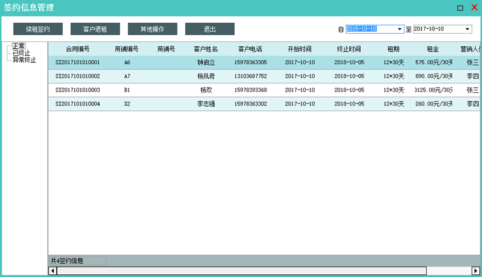 | 签约管理:可以依据合同开始时间对合同信息进行筛选。支持提前终止合同(右键菜单"异常终止合同")。签约管理中可以对查看合同详情、查看缴费情况、查看缴费日历以及快速续住或者退租等功能。 |